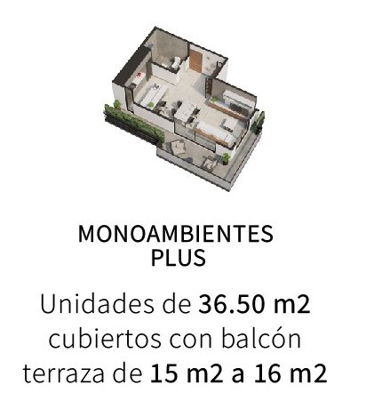 - Las unidades monoambiente PLUS aproximadamente miden 36.50 m2 cubiertos con balcon terraza de 16 m2.